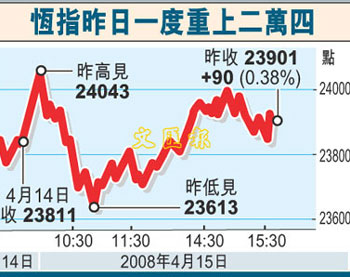 中新網(wǎng)4月16日電 據(jù)香港文匯報(bào)報(bào)道,大市缺乏方向,港股表現(xiàn)反復(fù)。15日大市高開139點(diǎn)后,一度重上24000點(diǎn)關(guān)口,但其后在高位沽壓顯著增加,恒指收市升90點(diǎn)至23901點(diǎn),成交縮減至714.5億元。分析員指,大市仍未能突破250天線,料短期內(nèi)大市仍在22000-25000點(diǎn)徘徊。