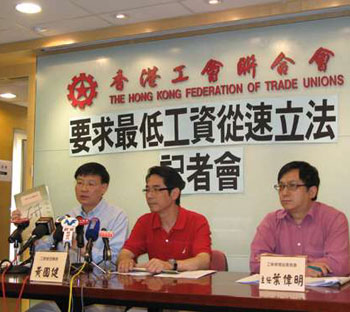 工資保障運(yùn)動(dòng)推行超過年半以來成效不彰,立法規(guī)管最低工資似乎勢(shì)在必行。工聯(lián)會(huì)理事長黃國健、立法會(huì)議員王國興和權(quán)益委員會(huì)主任葉偉明9日一同召開記者會(huì),公布該會(huì)研究部就立法規(guī)管最低工資的研究結(jié)果。