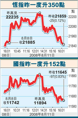 中新網(wǎng)8月12日電 據(jù)香港文匯報(bào)報(bào)道,受隔夜美股造好及內(nèi)地股市大挫影響,港股11日先升后跌,大市開市高開135點(diǎn),但午市受A股大跌逾5%影響,收市倒跌25.87點(diǎn),收?qǐng)?bào)21859.34點(diǎn),成交總額僅575.90億元。市場人士指,市場關(guān)注內(nèi)地的通脹數(shù)據(jù),港股后市料反復(fù),恒指或下試21500點(diǎn)。