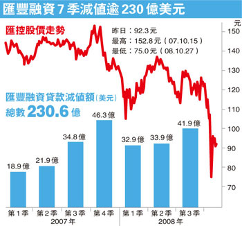 美國樓市持續(xù)下滑,愈來愈多人加入失業(yè)大軍,令匯豐按揭和信用卡貸款壞帳增加,第三季個(gè)人消費(fèi)融資的貸款減值損失,較上季增加7億美元,增至43億美元。