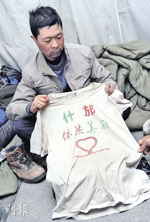 “眼看手勿動!”記者欲一睹黃福榮日記,男子立即阻止:“不行,我要將黃大哥的日記,親手交給他的家人!笔殖秩沼浀慕欣顦渲遥莾(nèi)地一家社福機構(gòu)的救災(zāi)義工,與阿福結(jié)緣于汶川地震,“我不單有黃大哥的日記,還有他在災(zāi)區(qū)穿過的T恤”。