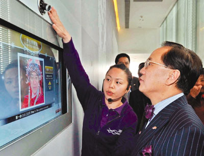 為推介香港館,煲呔(曾蔭權)不惜“粉墨登場”扮演粵劇大老倌?非也,原來香港館在入口處歡迎參觀者的是一個計算機造型游戲,曾蔭權親身上陣,一試游戲:“毋須粉墨也能裝一下大老倌,然后把趣怪扮相電郵給朋友!