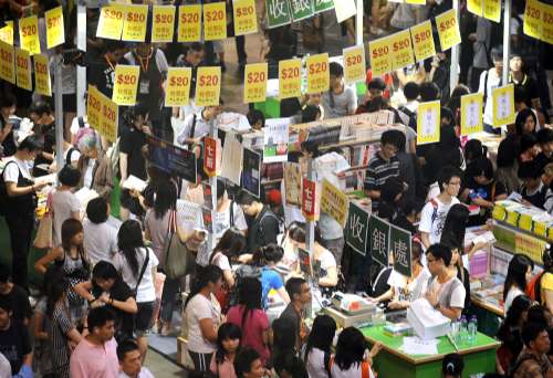 每年踏入書展尾聲,參展商都會瘋狂劈價促銷,務(wù)求散盡貨品。昨日會場仍見人頭涌涌,不少書迷手拎數(shù)個環(huán)保袋,以及拖篋入場,努力搜尋“抵買”心頭好。場內(nèi)所見,大小型書商已開始降價促銷,準(zhǔn)備最后沖刺;也有部分書商表示,今年的折扣優(yōu)惠較去年多,臨近尾聲不會再度“一刀切”劈價。