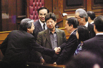 香港金融界的李國寶、專業(yè)會(huì)議的梁美芬、商界的黃宜弘、工業(yè)界的林大輝等立法會(huì)議員,在特首宣讀施政報(bào)告前,都爭相上前與其握手問好,歷時(shí)至少5分鐘,不知期間有否談及其因“小病是!,民望反而急升的事宜。