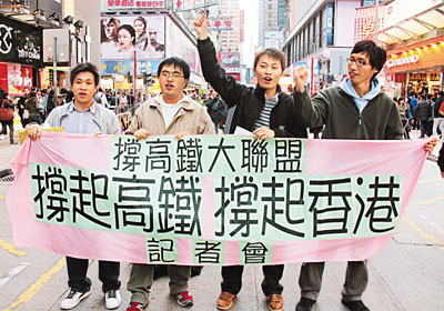社交網(wǎng)站近日有人組成“撐起高鐵,撐起香港”群組,并已有逾萬名支持者。一群生于上世紀70及80年代的人士更組成“撐高鐵大聯(lián)盟”,上周成立“集會支持西九起高鐵”群組,目前已有逾1100名支持者。4名聯(lián)盟成員13日在旺角街頭,呼吁其他高鐵支持者本周五往立法會門外靜坐,以示“撐高鐵”的決心。