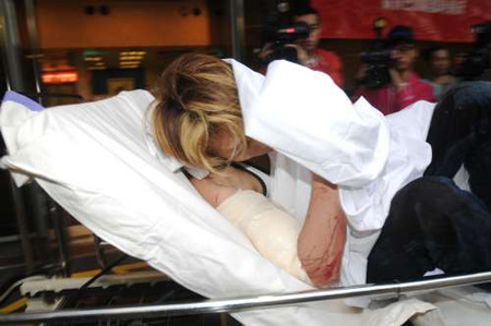 據(jù)悉,吳、鐘與3名同門兄弟,昨日凌晨在油麻地一間夜店因為“爭女仔”問題,與新義安人馬爭執(zhí),雙方在夜店并沒有動武。至清晨6時許,14K一方5人消遣后離開,途至油麻地佐敦道近廟街街頭時,突有3名手持牛肉刀的大漢追出,不由分說追斬各人,吳、鐘兩人走避不及,分別手部、腳部及背部中刀,渾身鮮血倒于街頭。3惡漢傷人后馬上跳上一輛接應黑色奧迪逃去。
