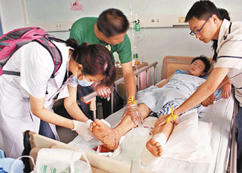 “所有病人中,最怕見到51床已截去左下肢的男子劉銳。從他時好時壞的情緒中,能感受到他所承受的痛苦。”尹淑玲背負一個紫紅色的背包,斜掛一瓶礦泉水。但在記者跟蹤采訪的近3個小時里,卻未見她停下歇歇喝一口泉水。