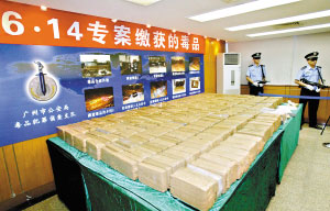 今年6月4日,經(jīng)過(guò)近一年的艱苦偵查,在公安部、廣東省公安廳禁毒局的指導(dǎo)協(xié)調(diào)下,在黃埔海關(guān)、安全等部門以及香港、澳門、廣東省有關(guān)地市警方的協(xié)助下,廣州市公安局成功破獲公安部督辦的“6·14”特大跨國(guó)走私可卡因案, 先后抓獲9名犯罪嫌疑人(其中兩名為外籍犯罪嫌疑人),繳獲毒品可卡因共約530千克及作案汽車3輛,成功切斷了一條從南美洲到中國(guó)的可卡因運(yùn)輸線。