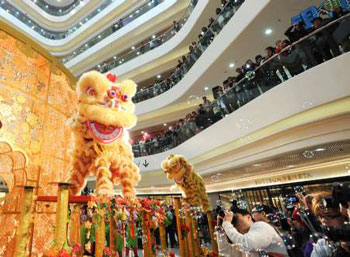 時(shí)代廣場(chǎng)2日舉行“富貴吉祥金牛陣”中樂表演賀新歲,場(chǎng)面熱鬧。在響亮的鑼鼓聲中,金龍旋轉(zhuǎn)舞動(dòng),三頭醒獅表演采青,吸引眾多途人駐足觀看,更有不少外籍游客錄像及拍照留念。