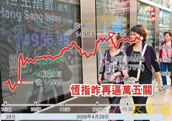 中新網(wǎng)4月30日電 據(jù)香港《文匯報》報道,市場憧憬國務院宣布將上海建設(shè)成國際金融中心及航運中心的細節(jié),A股29日午市急升近3%,刺激香港中資股升幅擴大,令港股在豬流感陰霾下連跌2天后終見反彈,于29日期指結(jié)算日被挾高,以接近全日高位收市,收報14956.9點升401.8點,總成交508億元。
