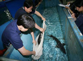 由于北京海洋館的中華鱘是一直在淡水環(huán)境下生活,所以在赴港前,三尾中華鱘都進行了一段時間的海化訓練,使其能在海水環(huán)境中適應生存。北京海洋館總經(jīng)理胡維勇表示,將會有兩名北京方面的專業(yè)飼養(yǎng)員隨同赴港。在此之前,已有部分香港海洋公園的工作人員在北京接受了一個星期的培訓。