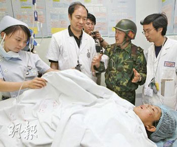 中新網(wǎng)5月22日電 據(jù)香港明報(bào)報(bào)道,“我吃野草、吃蚯蚓,我告訴自己要活下去,拼命的活下去!口喝了,沒(méi)有水,我便喝自己的尿,喝了兩三遍……不知過(guò)了多少天,劉大爺來(lái)到,他說(shuō):‘我是來(lái)救你的!’”21日再有一名在廢墟中重傷待援9日9夜的女工獲救,而負(fù)責(zé)救援的,正好是香港醫(yī)管局急癥?漆t(yī)生劉楚釗和護(hù)士劉炳發(fā)。