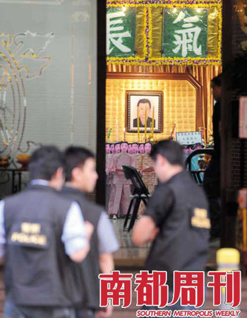 在靈堂掛著的另一副更正式的挽聯(lián)是:“劍膽無(wú)畏,永不妥協(xié)!膘`堂祭奠的死者,新義安近年最“出位”的黑道頭目,拼殺20余年的李泰龍,最終在8月4日凌晨,在自己的地盤(pán)尖沙咀,被仇家有計(jì)劃地?cái)貧ⅰ6潭?0秒的車(chē)撞、刀砍,曾經(jīng)傷人無(wú)數(shù)的他,最終血噴街頭而終,震撼香港。