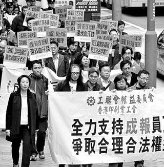 據(jù)香港文匯報報道,23日早約30名《成報》前員工由中環(huán)遮打花園出發(fā),一邊高叫口號,一邊游行到政府合署的律政司司長辦公室,要求律政司酌情發(fā)出禁制令禁止《成報》出版。其后獲律政司政務(wù)專員何淑兒代表接收請愿信,以及商討解決方法。