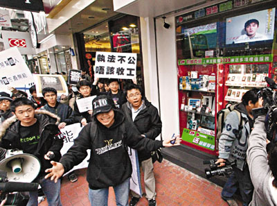網(wǎng)民沿途高叫口號(hào)及展示標(biāo)語(yǔ),游行人士途經(jīng)一間店鋪時(shí),店外電視正在播出早前陳冠希的道歉錄像,隨即惹來(lái)網(wǎng)民起哄,大呼“選擇性執(zhí)法可恥”等口號(hào)。
