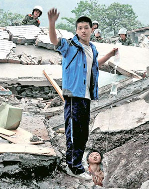 中新網(wǎng)5月22日電 據(jù)香港明報(bào)報(bào)道,地震災(zāi)區(qū)無數(shù)震撼人心的真實(shí)故事分分秒秒上演,5月14日《明報(bào)》頭版照片在讀者中引起了極大震撼。該報(bào)記者特意深入地震災(zāi)區(qū),查訪兩名相中人的下落,21日終于在綿陽找到兩名北川中學(xué)高一學(xué)生——手托鹽水瓶協(xié)助救人的李陽,和被埋在瓦礫下的廖波。