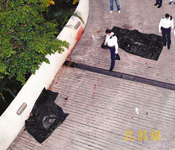 有街坊聽(tīng)到一聲巨響后,發(fā)現(xiàn)一男一女倒伏在芷葵樓一條緊急車(chē)輛通道,兩人相距約3米,大驚之下致電報(bào)警。救護(hù)員到場(chǎng),證實(shí)兩人頭爆肢折當(dāng)場(chǎng)死亡,警員事后以帆布架遮蓋尸體,然后上樓追查兩人墮樓位置。