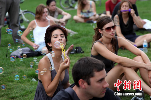 中新社多倫多7月17日電 (記者 賴海隆)數(shù)百名攜帶吹氣泡用品的抗議者17日正午時(shí)分在多倫多皇后公園里同時(shí)吹出氣泡,以表達(dá)對“氣泡警官”喬瑟夫斯憤怒,以及對G20峰會期間警方行為的公眾調(diào)查的支持。