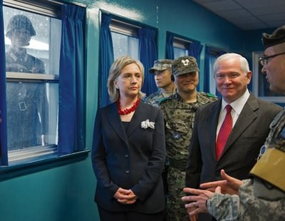 美國媒體報道稱,當(dāng)希拉里和蓋茨走進(jìn)軍事停戰(zhàn)委員會樓時,對面一方的朝鮮士兵立即透過窗戶,對兩人怒目而視。