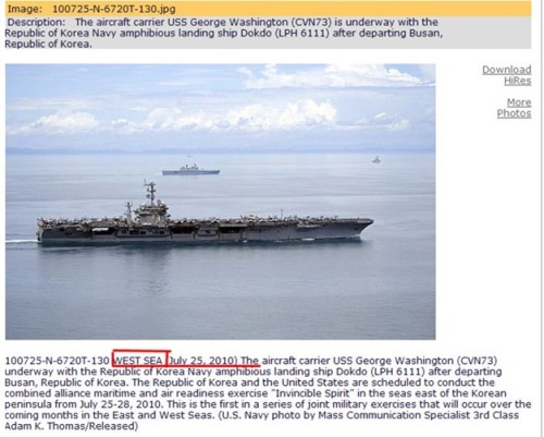 記者于7月28日再次登錄美國海軍官方網(wǎng)站,發(fā)現(xiàn)之前被標(biāo)為拍攝于“西!(中國稱“黃海”)并在7月27日被刪除的照片,已經(jīng)再度被上傳到網(wǎng)站上,而其標(biāo)注的地點(diǎn)已經(jīng)被更正為“日本!。