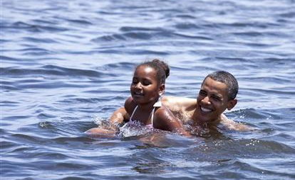 奧巴馬當(dāng)天赴佛羅里達(dá)州濱海游泳,宣布墨西哥灣海灘“開業(yè)”,以親身榜樣向旅游者表示,在受英國石油漏油影響的這個(gè)地區(qū)游玩很安全。