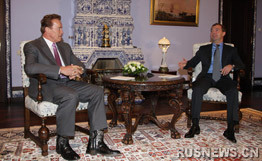 中新網(wǎng)10月11日電 據(jù)俄新網(wǎng)報(bào)道,11日,俄羅斯總統(tǒng)德米特里·梅德韋杰夫在戈?duì)柣偨y(tǒng)官邸接見美國加里福尼亞州州長阿諾·施瓦辛格。
