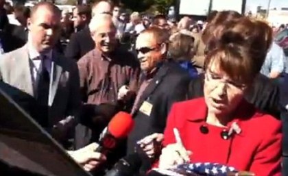 佩林在出席集會(huì)時(shí),支持者遞給她帽子、球衣和書(shū)籍以獲得簽名。而當(dāng)有人遞上國(guó)旗時(shí),她也毫不猶豫的用記號(hào)筆在旗面上揮筆寫(xiě)下自己的名字,而后還揮動(dòng)國(guó)旗并將其送還給支持者。