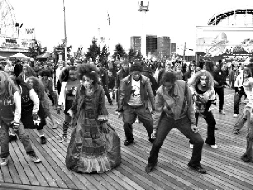 23日,在紐約布魯克林,人們模仿邁克爾·杰克遜專輯《戰(zhàn)栗》里的“僵尸舞”動(dòng)作,迎接即將到來(lái)的萬(wàn)圣節(jié)。這也是為紀(jì)念這位已故流行樂天王而在全球各地展開的“讓世界戰(zhàn)栗”活動(dòng)的一部分。當(dāng)天,全球30多個(gè)國(guó)家的270多個(gè)城市的杰克遜歌迷也在同一時(shí)間跳起了“僵尸舞”。(宗和)