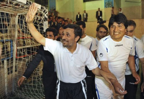 中新網(wǎng)10月29日電 據(jù)外電報道,伊朗總統(tǒng)穆罕默德·內(nèi)賈德和玻利維亞總統(tǒng)莫拉萊斯長久以來因相似的政治立場和對美國的尖銳批評而為世界所矚目。現(xiàn)在,他們又站在同一陣營中,不過這一次是在五人制足球場上。