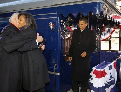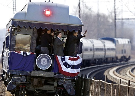 奧巴馬在乘坐專列由費(fèi)城啟程前往首都華盛頓途中,開(kāi)始總統(tǒng)就職的一系列活動(dòng)。當(dāng)天也是其妻子米歇爾45歲的生日,他們?cè)诨疖嚿蠎c祝,兩人沿途又向群眾揮手,很多人夾道歡呼,有人舉起寫上“米歇爾生日快樂(lè)”的標(biāo)語(yǔ)牌。