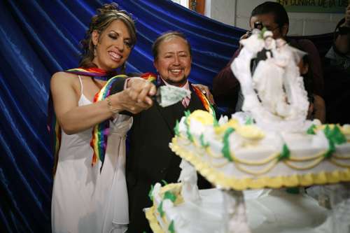 均做了變性手術的墨西哥新人在大群記者面前切結婚蛋糕。