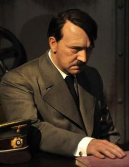 這尊蠟像塑造的是蘇聯(lián)紅軍兵臨城下后希特勒在自殺前的最后時(shí)刻。與其他蠟像不同的是,表情垂喪的希特勒坐在一張桌子后面(見(jiàn)圖)。蠟像館的人這樣安排,其用意是防止有人與希特勒蠟像合影,或者毀壞蠟像。