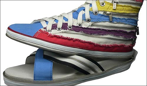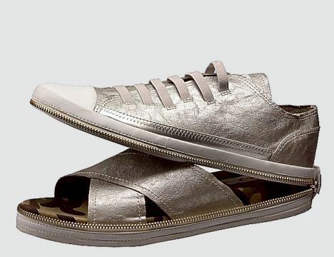 這種多變鞋被稱為Nat-2,它看上去就象一雙普通的匡威牌帆布鞋。但如果你想讓腳透氣,只需解開拉鏈,這時呈現在你面前的就是一雙涼鞋了。帆布鞋的上部能夠很容易地折疊起來,放進包里。目前有20種不同的樣式可供選擇,人們可以根據自身喜好選擇不同的款式進行搭配。該創(chuàng)意很可能來自于20世紀80年代的動畫片變形金剛。然而與這些到處都能買到的塑料機器人不同的是,人們很難找到出售Nat-2鞋子的商店。目前,在英國唯一取得該鞋子經營權的是位于倫敦西南部亭克漢姆(Twickenham)的 Wild Goose。每雙鞋子的售價為59.99英鎊。