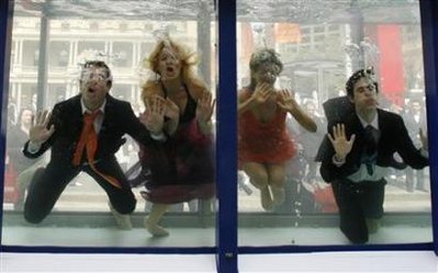 9名穿著時(shí)尚的模特,爬上梯子后,縱身跳入位于悉尼環(huán)形碼頭的水槽,讓攝影師捕捉鏡頭,同時(shí)也取悅路人。