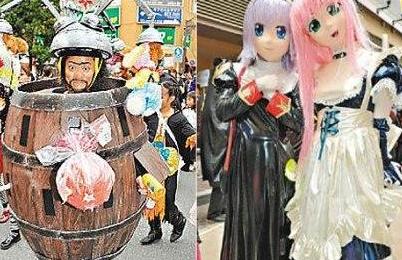 游行隊(duì)伍中,一名男子以啤酒桶裝現(xiàn)身,頭盔還掛上各種吊飾,成為矚目焦點(diǎn)。還有兩名女子戴上面具,打扮成漫畫美少女。