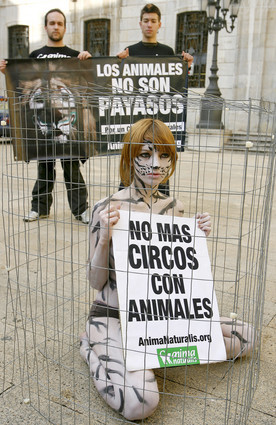 該女子身上涂滿了彩繪,把自己關在一個籠子里,手持“不要再和動物耍花招”的標語。