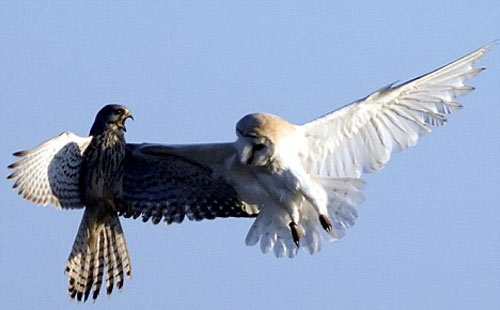 通常情況下,茶隼和貓頭鷹能夠和平相處,兩者并非天敵,而且一個在白天捕食,一個在夜間行動。茶隼攻擊貓頭鷹和貓頭鷹白天進(jìn)行捕食的現(xiàn)象都不是正,F(xiàn)象。