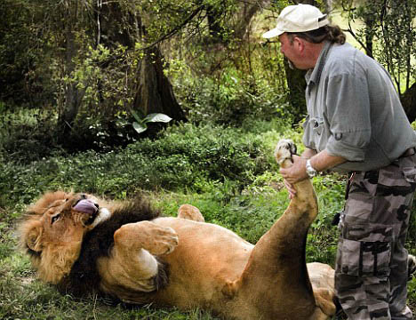據(jù)英國(guó)《每日電訊報(bào)》報(bào)道,英國(guó)人亞歷克斯·勞倫提今年50歲,有兩個(gè)孩子。他在南非約憨內(nèi)斯堡附近的獅子公園里工作,負(fù)責(zé)照料75頭野性十足的獅子。和他關(guān)系最親密的是一頭叫賈穆的8歲雄獅。在照片上,他不但和賈穆?lián)ПП,還為它按摩腳掌,賈穆看上去則十分舒適自在。亞歷克斯說(shuō),他花了6年時(shí)間才和賈穆達(dá)到目前的和諧關(guān)系。