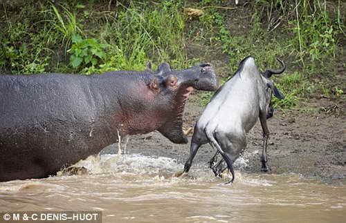 據(jù)英國(guó)《每日郵報(bào)》報(bào)道,一只黑尾牛羚從一頭饑餓(或者說是心情不好)的河馬口中死里逃生。張著大嘴的河馬看上去發(fā)現(xiàn)了一個(gè)非常容易對(duì)付的目標(biāo)。