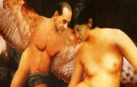 在潘塞卡的這幅作品中,貝盧斯科尼化身赤裸著身體的天使,用巨大的翅膀親昵地?fù)е獯罄麢C(jī)會(huì)平等事務(wù)部長(zhǎng)瑪拉·卡爾法尼亞,含情脈脈地盯著自己的女部下。