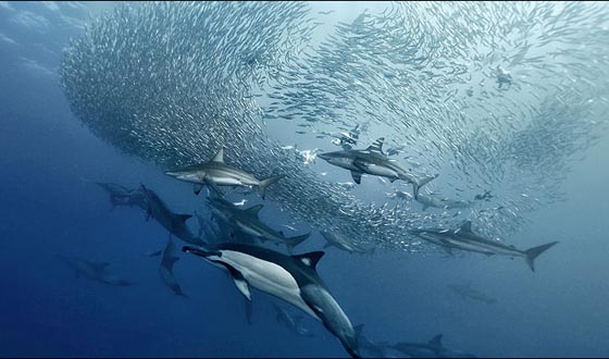 這群從南非海域向更暖和的印度洋遷徙的沙丁魚(yú)不僅要面對(duì)能以每小時(shí)40海里行進(jìn)的鯊魚(yú)和海豚的追逐,還要防止陰險(xiǎn)的塘鵝從空中的偷襲。