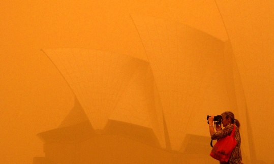 澳洲東部星期三遭遇數(shù)十年來最嚴重的沙塵暴,悉尼市被覆蓋,交通受阻。強風(fēng)把數(shù)以噸計的紅色沙塵傾倒在澳洲最大城市悉尼,使悉尼覆蓋在怪異的赤色迷霧中,著名悉尼歌劇院被涂上一層厚厚的沙塵。