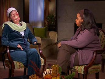 查拉-納什(Charla Nash)一現(xiàn)身節(jié)目,現(xiàn)場(chǎng)觀眾都非常震驚,即使見(jiàn)多識(shí)廣的歐普拉,也坦言從來(lái)沒(méi)見(jiàn)過(guò)這么可怕的面孔,就算是燒燙傷患者都沒(méi)有傷成這種程度──查拉這張臉,已沒(méi)有了眼睛、鼻子、嘴唇,甚至雙手也重殘,10個(gè)指頭全被咬斷。