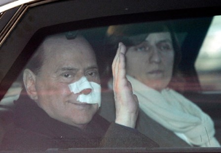 現(xiàn)年73歲的意大利總理貝盧斯科尼13日出席一場(chǎng)政治集會(huì)時(shí),遭攻擊者以石制米蘭大教堂模型丟擊中臉部,鼻梁被打斷,牙齒也掉了兩顆。他臉部和嘴唇被割傷、血流滿面的狼狽鏡頭,短短數(shù)秒之內(nèi)就被媒體播送到全球數(shù)百萬(wàn)觀眾的眼前。