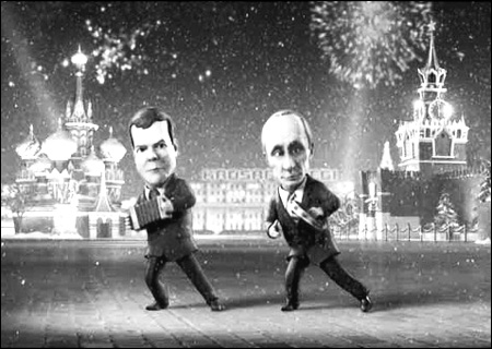 元旦夜晚,俄羅斯國家電視臺第一頻道突然出現(xiàn)了總統(tǒng)梅德韋杰夫和總理普京的形象,只是這次他們變成了3D卡通玩偶。在時長兩分半鐘的短片中,左邊的梅德韋杰夫拉著手風(fēng)琴,右邊的普京手搖鈴鼓,兩人在紅場上邊唱邊跳,共同評說2009年,不但諷刺了烏克蘭天然氣事件,還把梅、普共治體制幽默了一把。