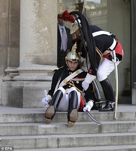 22日,法國總統(tǒng)薩科齊和夫人布魯尼接待前來法國訪問的卡塔爾埃米爾夫婦。在結(jié)束各項接待禮儀后,薩科齊牽著布呂尼的手走進愛麗舍宮。而在與守候在外的記者告別前,布魯尼仍不忘微笑揮手,這時的前超級名?芍^“回眸一笑百媚生”。正當記者們狂按相機時,站在愛麗舍宮正門外臺階上的一名衛(wèi)兵也“激動的不行”,以致眼神發(fā)直,腿軟倒地,另外一名衛(wèi)兵見狀趕緊上前攙扶。