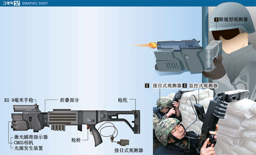 拐角槍是將既有步槍的槍身折疊后,在槍的末端安裝口徑9毫米的K5手槍。為能夠確認(rèn)墻外的目標(biāo)并瞄準(zhǔn),安裝了數(shù)碼相機(jī)和激光目標(biāo)指示器。據(jù)此,戰(zhàn)斗兵在墻后擺好拐角槍,通過觀看數(shù)碼半導(dǎo)體相機(jī)拍攝的影像對準(zhǔn)激光目標(biāo)指示器然后進(jìn)行射擊。有效射程為50米,可左右折疊60度進(jìn)行自由射擊。應(yīng)用于實戰(zhàn)還將需要1到2年的時間。
