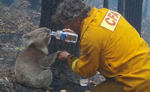 今年二月,由于高溫干旱,澳大利亞維多利亞州發(fā)生了歷史上最嚴重的林火,造成173人死亡,7500人無家可歸。當時,在距墨爾本東南約120公里處的維多利亞州山火現(xiàn)場,一位名叫特里的消防員救出了這只樹袋熊,并用礦泉水瓶給它喂水。這個畫面被特里的同事用手機拍攝下來,此后被媒體廣泛傳播,這只樹袋熊頓時成為世人關注的焦點。