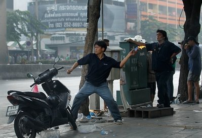 示威地點(diǎn)靠近金融區(qū)的是隆路與拉瑪四路也有抗議人士焚燒垃圾車和輪胎,挑釁鎮(zhèn)暴部隊(duì)。位于拉瑪四路的隆比尼拳擊場(chǎng),軍隊(duì)也遭M79榴彈攻擊,軍隊(duì)再鳴槍示警,紅衫軍憤而焚燒公共電話亭。
