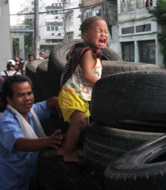 有關(guān)這名男童在示威者和泰國士兵對峙前線的視頻已被上傳至網(wǎng)站,包括婦女和兒童在內(nèi)的5000名紅衫軍示威者正為軍方把他們從營地里強(qiáng)行驅(qū)逐出去作準(zhǔn)備。